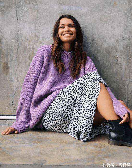 彩色毛衣在搭配上没有限制,尤其是在下装的选择上,大家可以像博主一样选择豹纹元素的及踝裙,黑白配色和紫色毛衣相互衬托,简约基础又耐看。