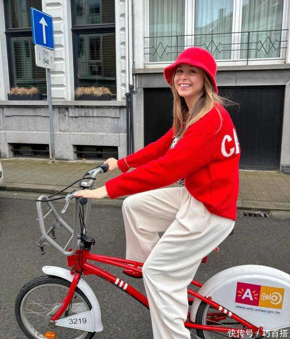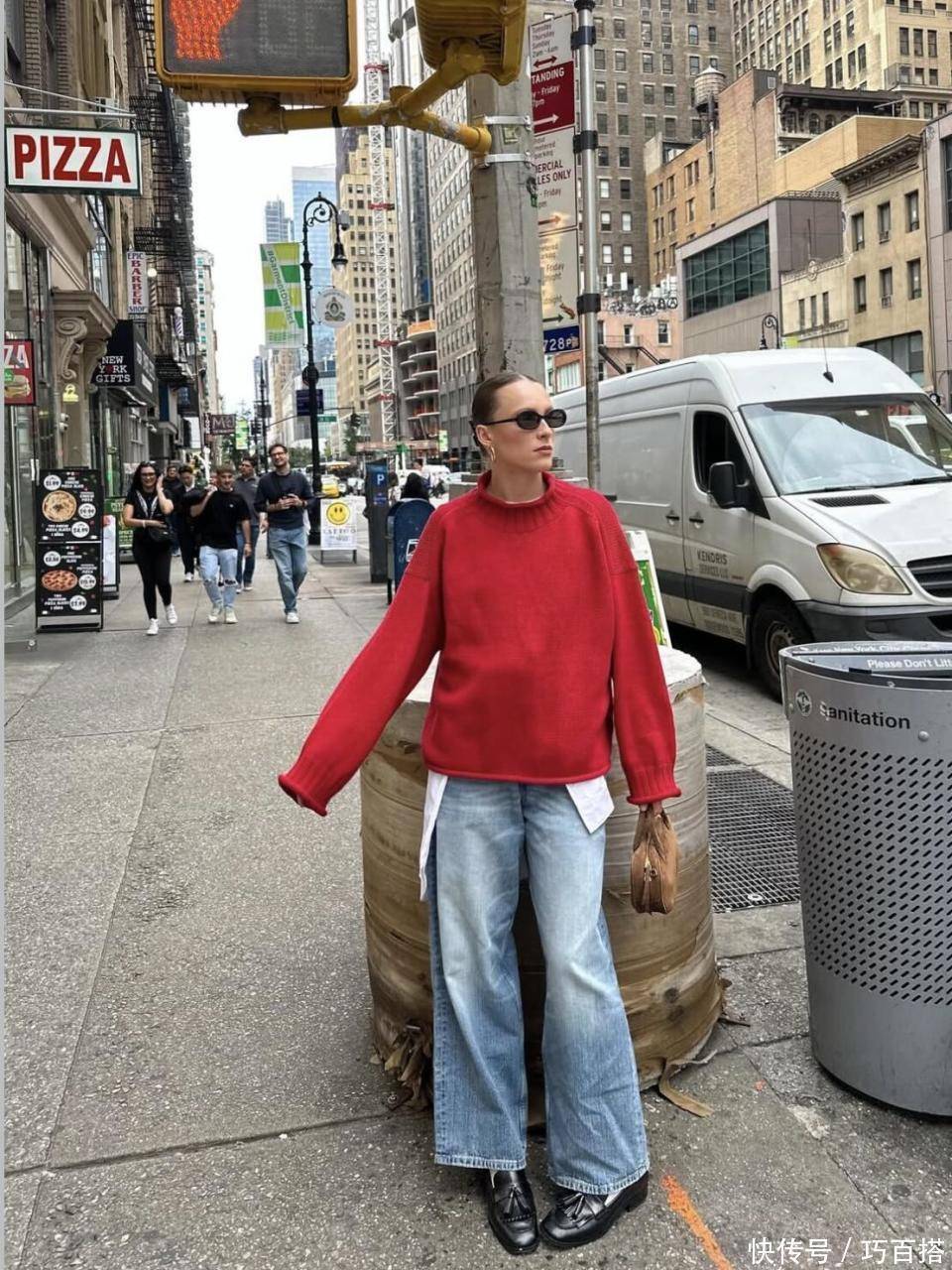 选择低饱和度红色毛衣时搭配同色系长裤呈现效果就完全大不同了,颜色冲击力强,很容易让人产生审美疲劳,不适合日常出门时选择。