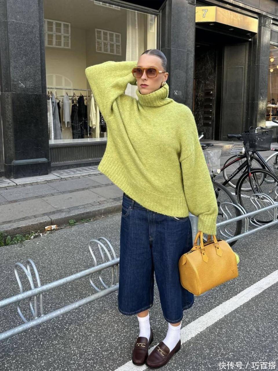 腈纶混纺或羊毛材质的彩色毛衣上身,有挺括感又精致立体,上身显瘦能力一绝,超高领设计既能挡住双下巴又能增加层次感和时髦氛围,单穿不单调,叠穿也有情调,对高个子女生来说非常友好。