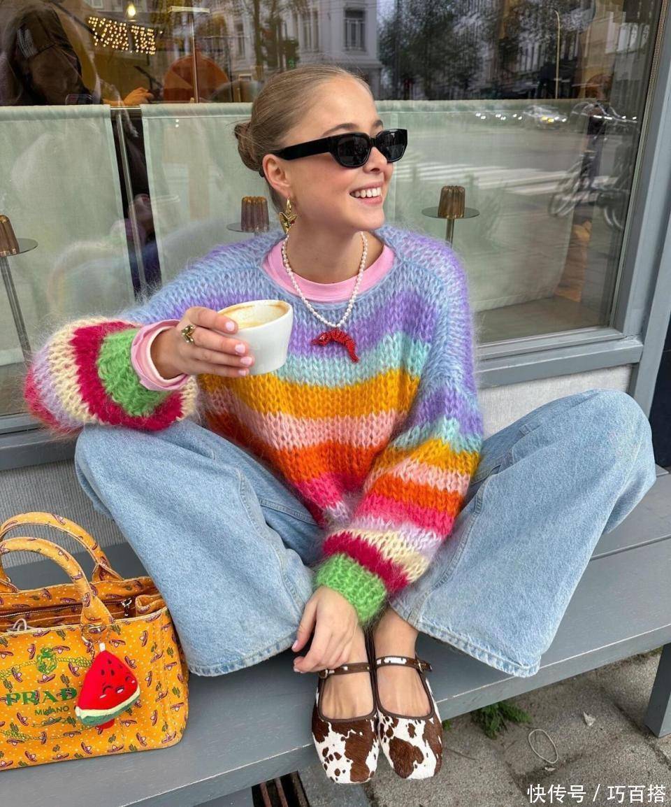 马海毛或羊毛混纺彩色条纹针织毛衣,针织走线清晰明了,不过这种款式设计有利也有弊,有利的点在于走线稀疏、有氛围感又异常松弛,不利的点是它保暖性欠缺,尤其不适合大风天气单穿出门,每一个空隙都钻风,对怕冷姐妹来说格外不友好。