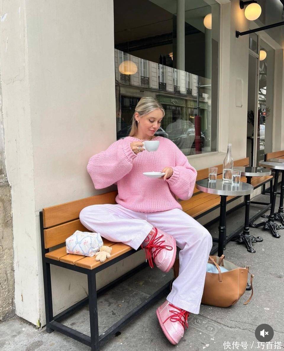 如果你身材、气质、肤色都是优等,也可以尝试同色系的搭配模式,但前提是你选择的是淡彩色的针织毛衣,比如博主身上这类淡粉色,用它搭配粉白色长裤也能赚足回头率。
